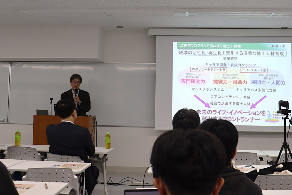 後半では、愛媛大学教育・学生支援機構の瀬野特定教授および新潟大学大学院支援機構の弥富特任教授から、各大学における博士課程学生への支援事業について説明が行われ、あわせて新潟大学の院生会の取り組みについても紹介されました。博士課程学生の研究活動や生活を支える体制について理解を深める時間となりました。最後に、新潟大学本田副学長より閉会の挨拶があり、本発表会は盛況のうちに幕を閉じました。