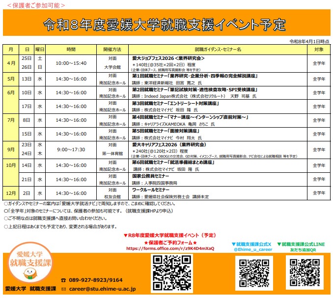 令和8年度に開催予定の以下の全学年対象のセミナーは、保護者の方もご参加いただけます